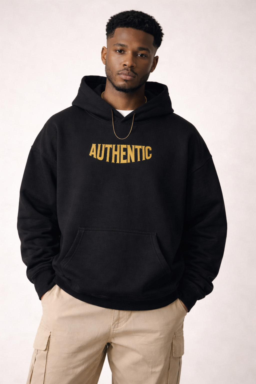 Crafted from premium heavyweight fleece with an intentionally oversized fit, this hoodie is built for structure, warmth, and everyday wear. The gold “Authentic” front print and bold back statement serve as a reminder: you either stand firm in who you are, or you blend into everyone else.